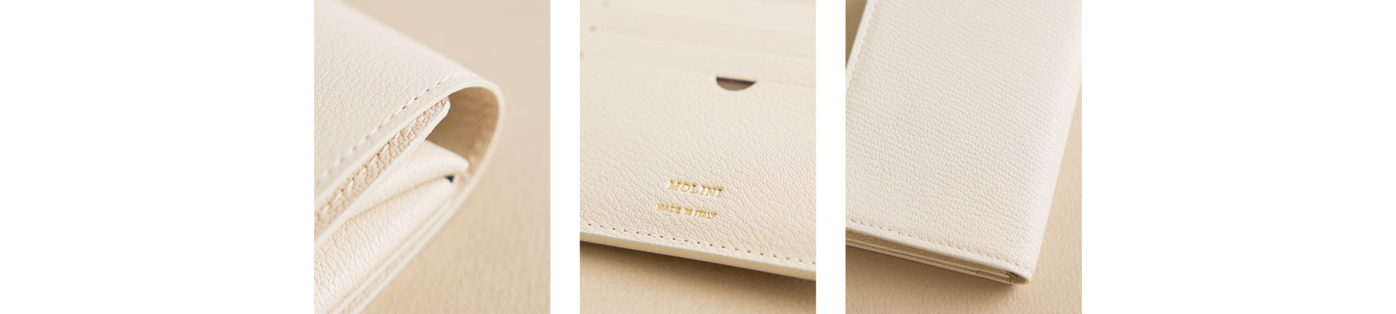 しかし、MOLINIのアイテムに使用しているゴートレザーは、キズがつきにくく、型崩れしにくいため、長くお使いいただいてもその美しさと上品さを保ち続けることができます。